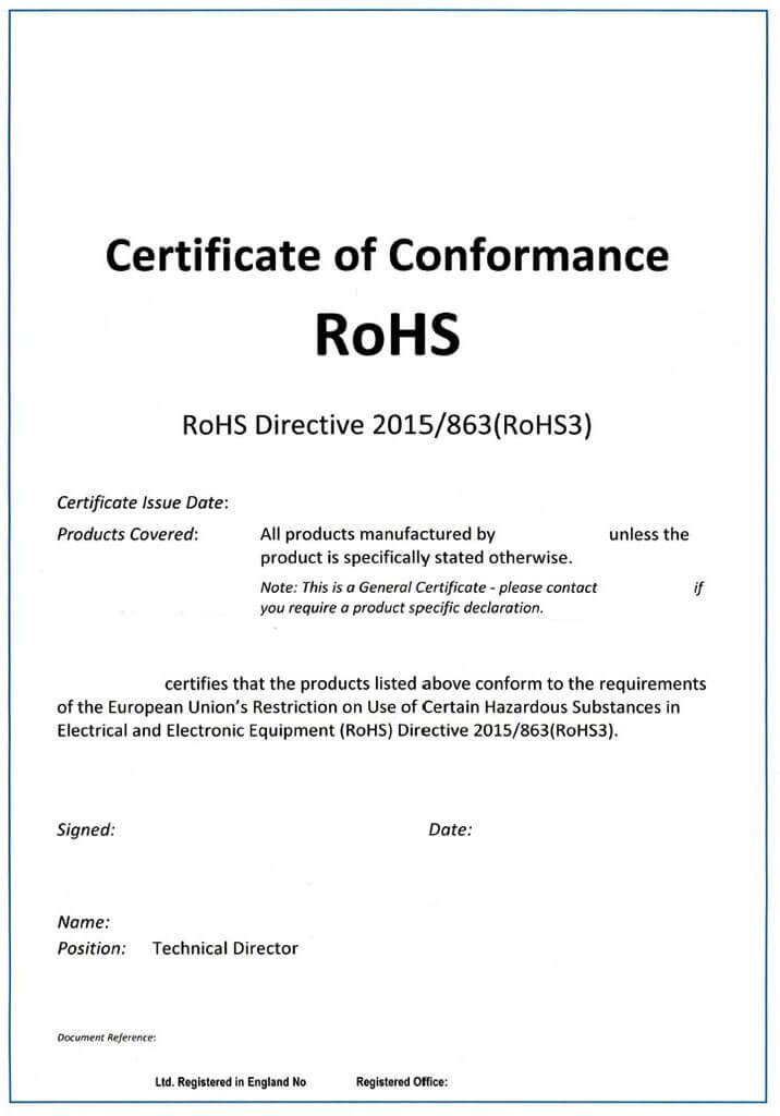 Its testing cost depends on the substances used in the product. The more substances, the higher the cost. It usually takes around 7 days for testing. If your products meet the standard, they will issue a RoHS compliance certificate. There is no specific format, which depends on the inspection company you choose. Here is one for your reference.
